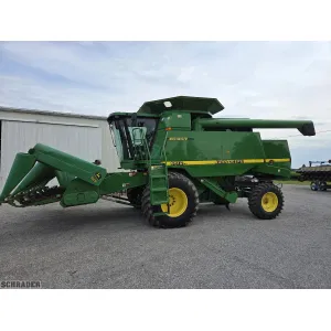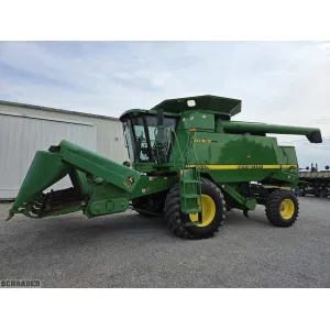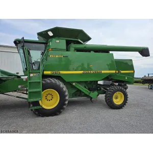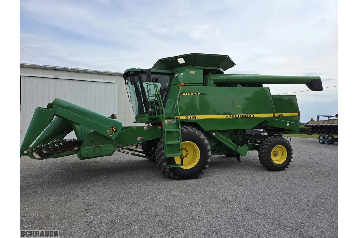 1998 JD 9510 combine, Maurer bin extension, chopper, twin spreaders, yield monitor, Cab Cam, 30.5L-32 drives, 16.9-26 steers, 4491 engine, 3006 separator