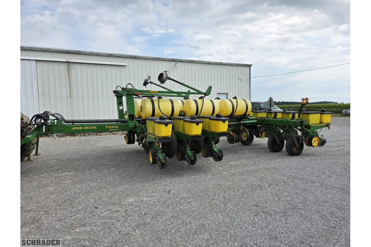 JD 7200 Conservation 12 row 30" planter, liquid fertilizer, flat fold markers, Dawn no-till coulters, dual spring down pressure, rubber closers, firmers, finger pickup, fold box & JD Computer Trak 250 monitor