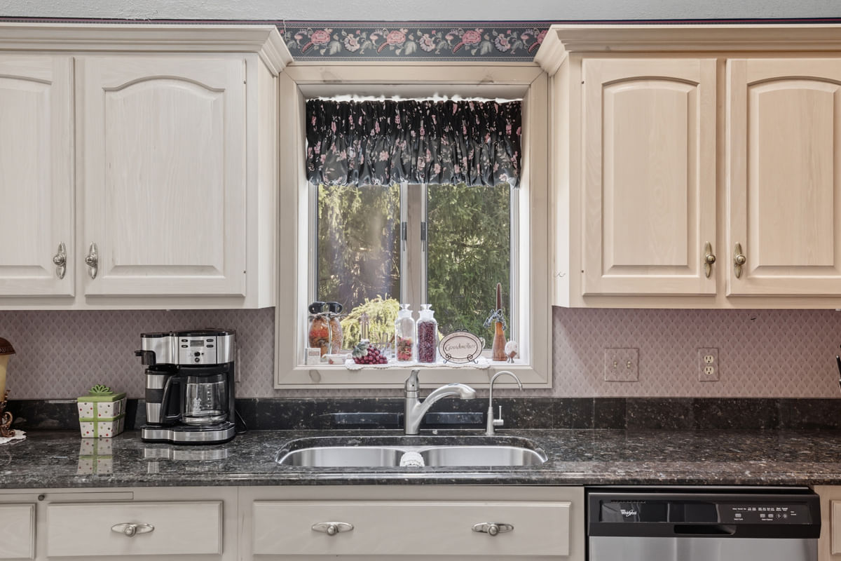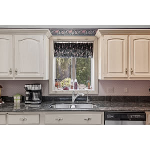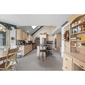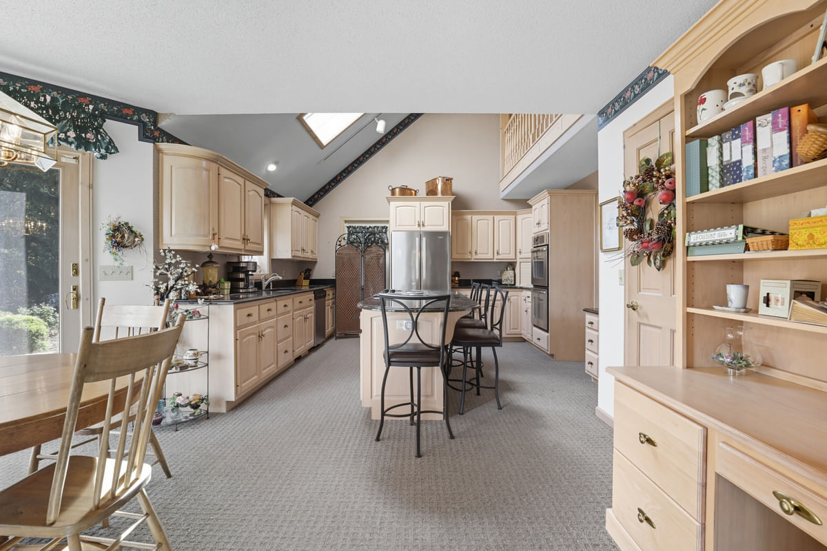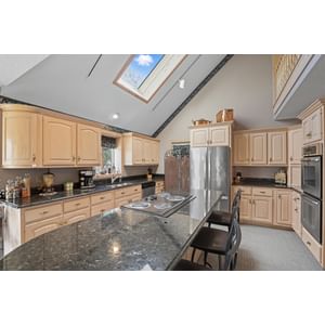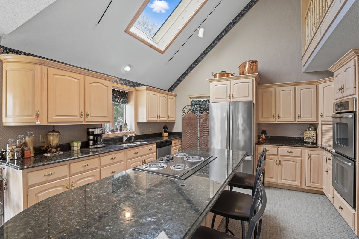 Kitchen - 14 x 12: A cook's delight! The spacious kitchen includes a large 8' breakfast bar with seating for four, granite countertops, and beautiful blonde Dutch Made cabinetry. Stainless GE double ovens, Whirlpool refrigerator/freezer (1-2 years old), Whirlpool dishwasher, and 4-burner electric cooktop make this kitchen both stylish and functional. Additional highlights include a daylight window, built-in desk/bookcase, and a large walk-in pantry.