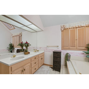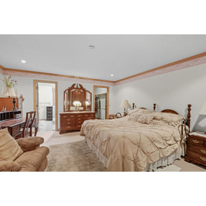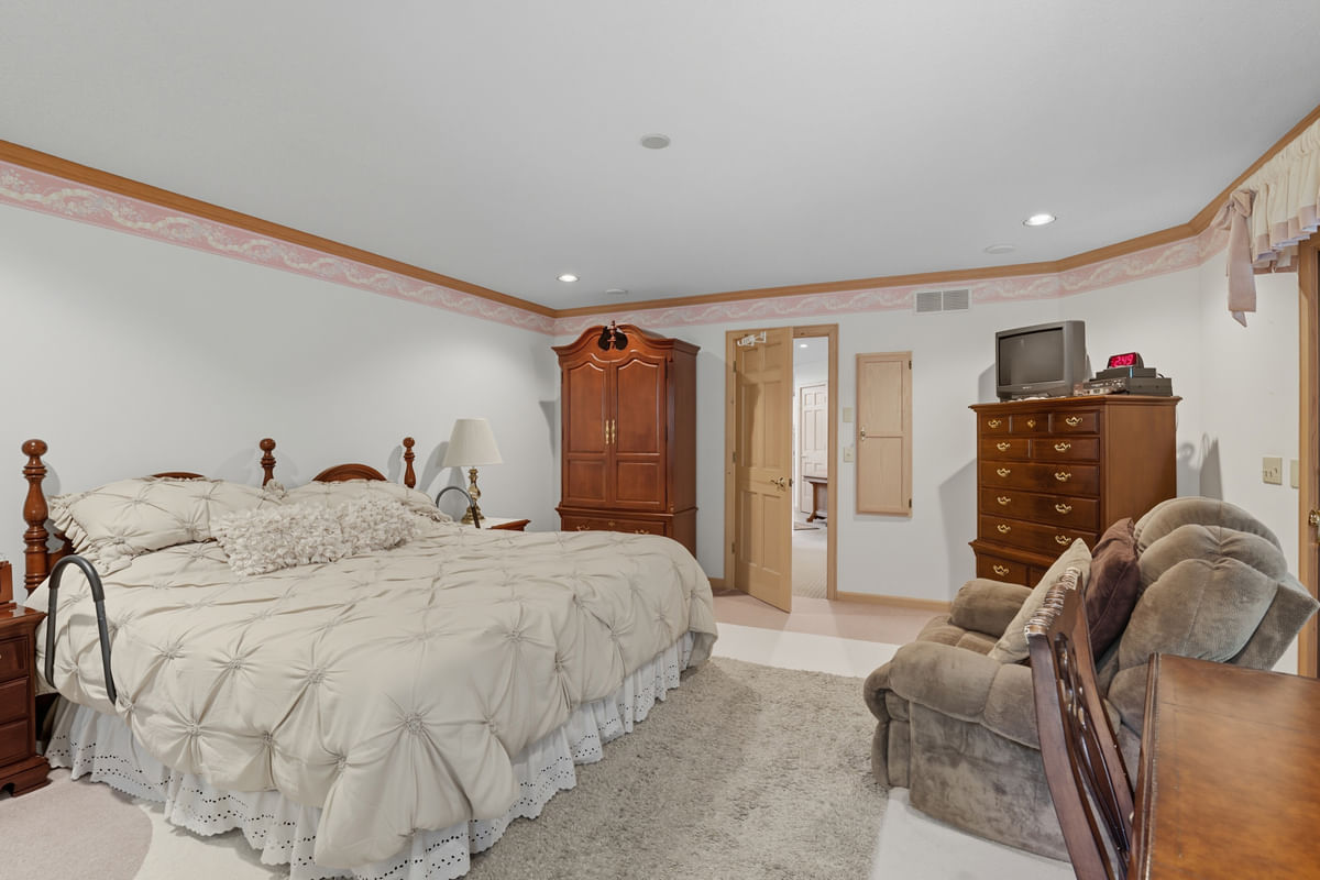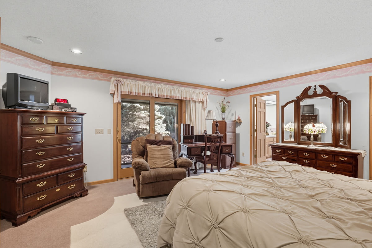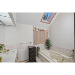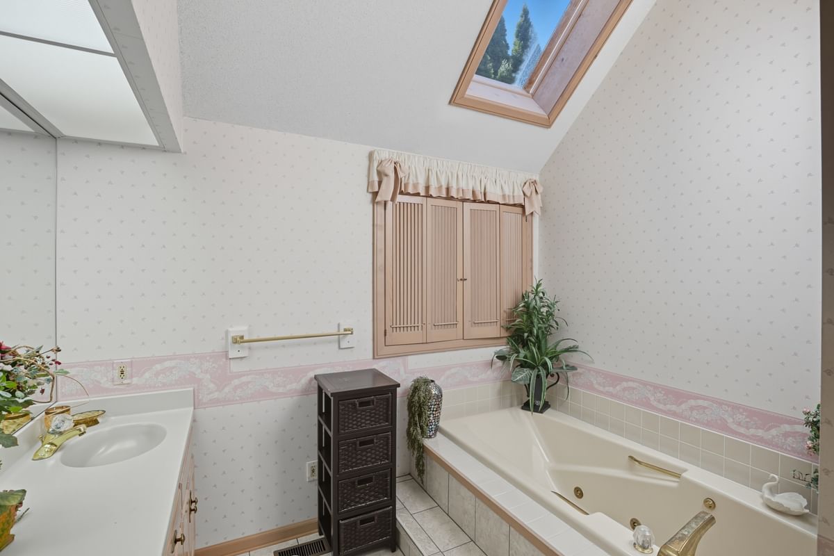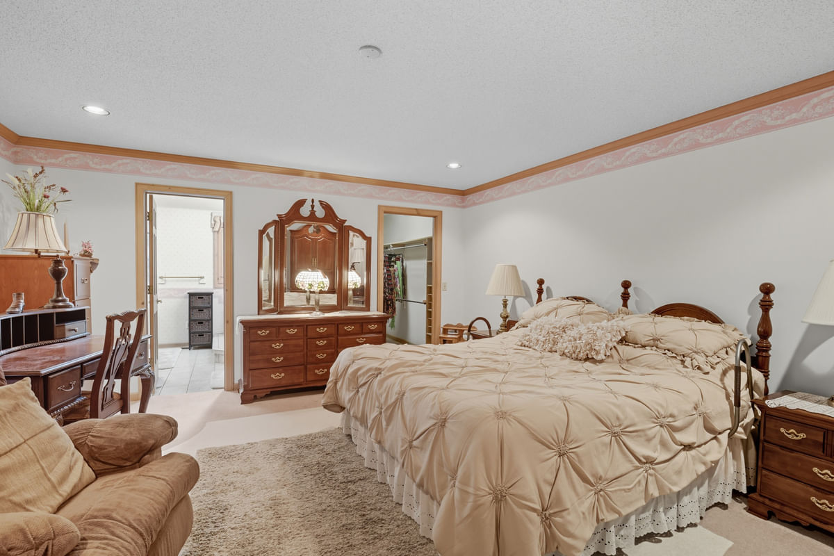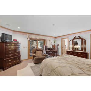 Primary Bedroom - 17 x 15: Your private retreat on the main floor! Features include carpet, recessed lighting, a sliding door to a covered patio, and a spacious walk-in closet. The en-suite bath offers a jetted garden tub, walk-in shower, double vanity, and skylight for natural light.