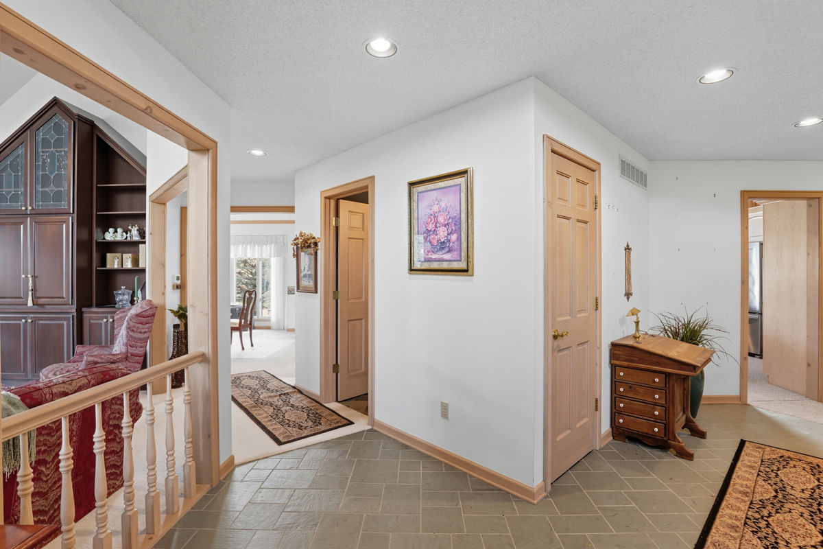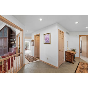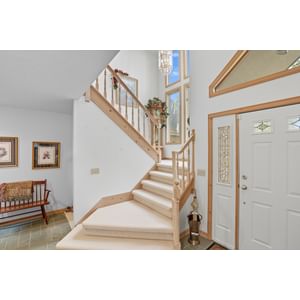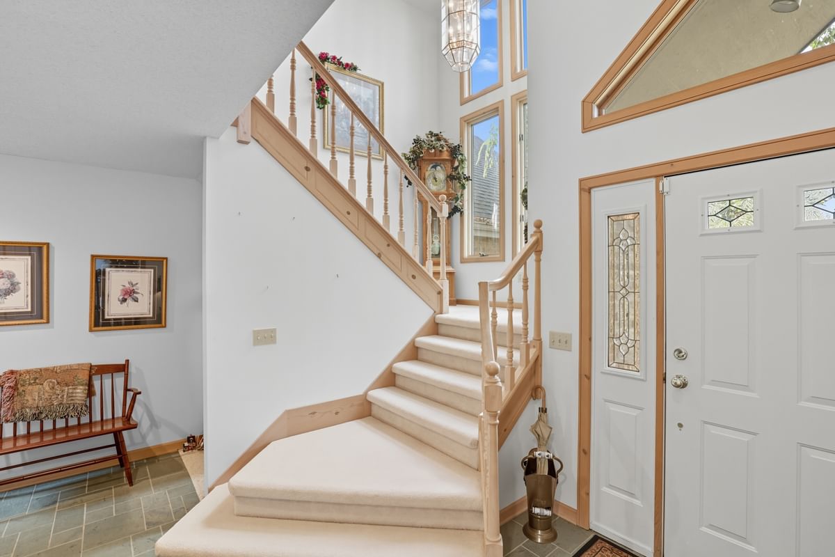 Foyer: Step through the beautifully tiled foyer with a convenient coat closet. From here, move easily into the living room, head upstairs, or continue through to the kitchen - the home's welcoming layout makes it easy to flow from one space to another.