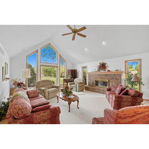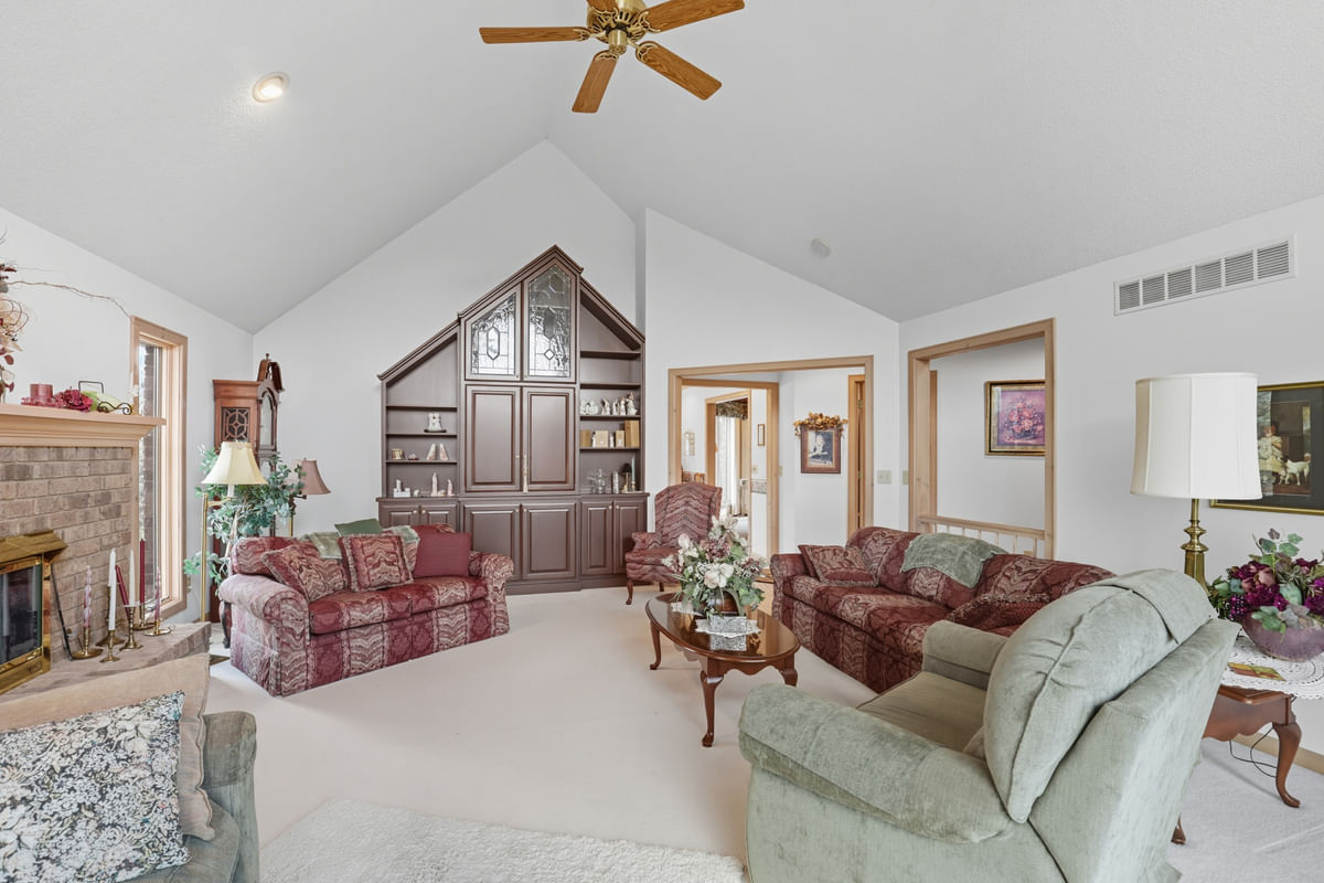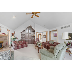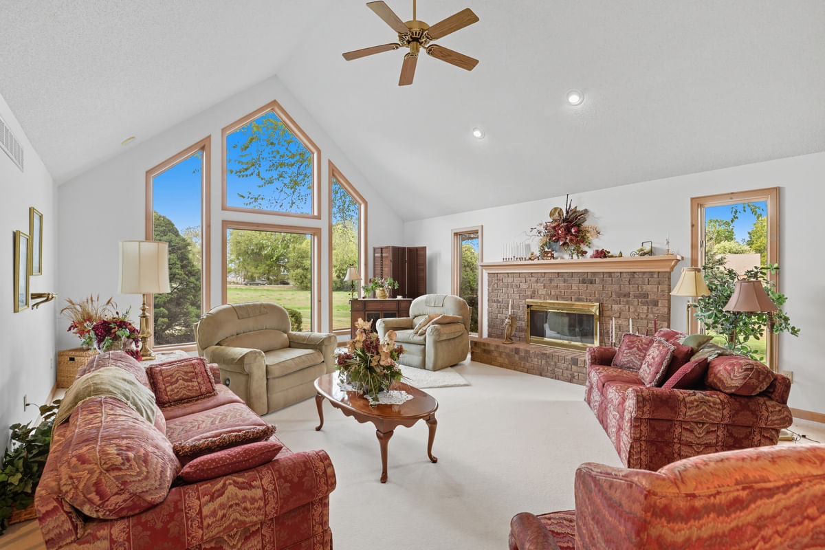 Living Room- 17 x 23: A stunning space filled with natural light from floor-to-ceiling cathedral windows. The gas-log brick fireplace creates a warm focal point, flanked by side windows and complemented by a ceiling fan, plush carpet, and a large built-in entertainment center/bookcase - perfect for cozy evenings or entertaining guests.